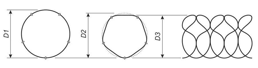 Но существует еще один диаметр спирального барьера – виртуальный, и возникает он из-за особенностей конструкции самой спирали и сложности измерения ее диаметра. На результаты измерения диаметра установленного спирального заграждения может повлиять тот факт, что заграждения являются сетчатой конструкцией, асимметричной по местам скрепления скобами, а не сплошным цилиндром. При этом количество скоб всегда нечетное – отсюда и асимметричность. Для точного определения диаметра спирального заграждения необходимо измерять диаметр окружности, описанной вокруг спирали, а не расстояние между крайними точками армированной колючей ленты в заграждении в его конкретном сечении.