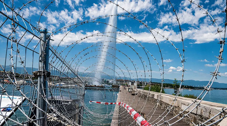 Колючая проволока была установлена не только на ограждении виллы, где проходил саммит, но и на многих других участках территории Женевы. Стоит отметить, что для ограждения использовалась не современная армированная колючая лента Егоза, которая обычно применяется для ограждения важных объектов, а классическая колючая проволока в виде спирали Бруно, известная более чем сотню лет.