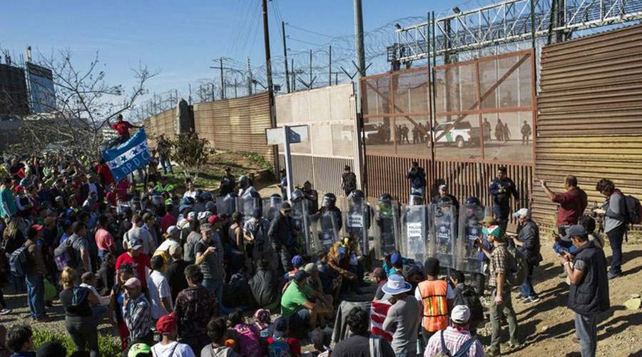 Мігранти з Центральної Америки біля паркану з колючим дротом на кордоні США з Мексикою